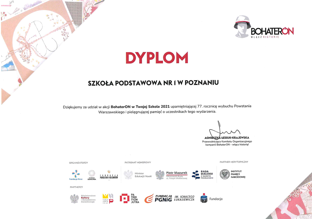 W roku szkolnym 2021/2022 nasza Szkoła przystąpiła do ogólnopolskiej historycznej kampanii „BohaterON”. Ma ona na celu upamiętnienie oraz uhonorowanie uczestników Powstania Warszawskiego, a także przybliżenie historii Polski XX wieku.