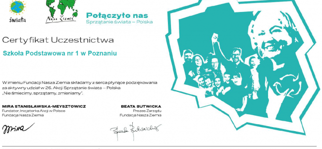 Szanowni Państwo, Dziękując za zaangażowanie i doceniając Państwa udział w tegorocznej akcji Sprzątanie Świata, przesyłamy Certyfikat uczestnictwa, przygotowany przez głównego organizatora wydarzenia w Polsce – Fundację Nasza Ziemia oraz koordynatora akcji w Poznaniu – Wydział Gospodarki Komunalnej Urzędu Miasta. Liczymy na Państwa aktywność w kolejnych akcjach proekologicznych. Wydział Gospodarki Komunalnej